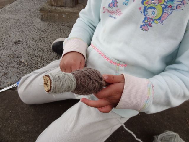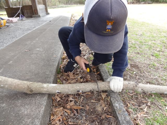 午後からものんびり運動園地で遊びました。葉っぱや枝や毛糸を使って工作やのこぎりで枝を切ったり、