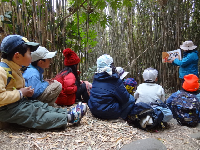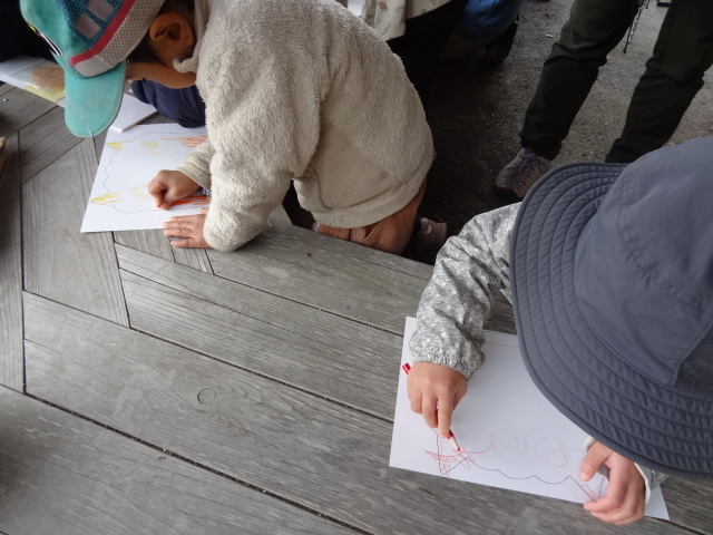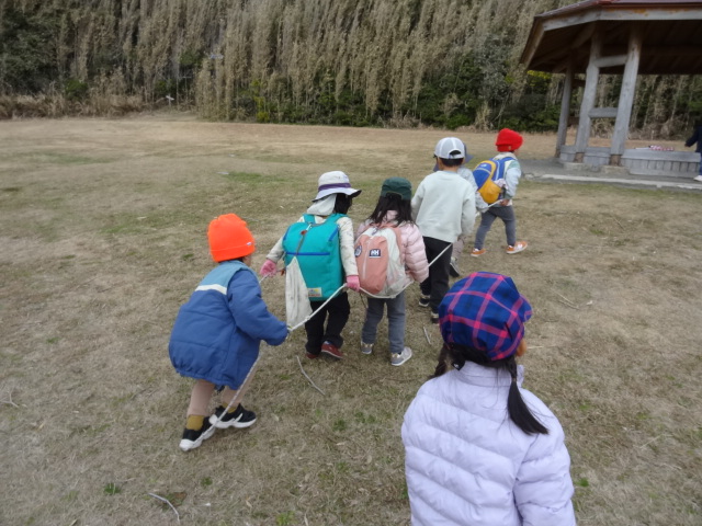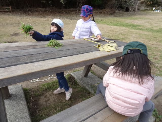 南芝生園地に着いてから、今日は鬼のお面作りを行いました。これは2月3日の豆まきの時に使います。鬼になったり、豆まきをしたりしましょうね。3回目のにじぐみさんはすぐに取り掛かり迷いもなく色塗り、鬼の顔を描いたりしていました。その様子を見ながらひかりぐみさん、ほしぐみさんも思い思いの鬼のお面を作りました。また続きをやりましょうね。