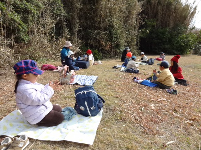 お昼ご飯はできるだけ風が避けられてお日さまが当たるところを探して食べました。