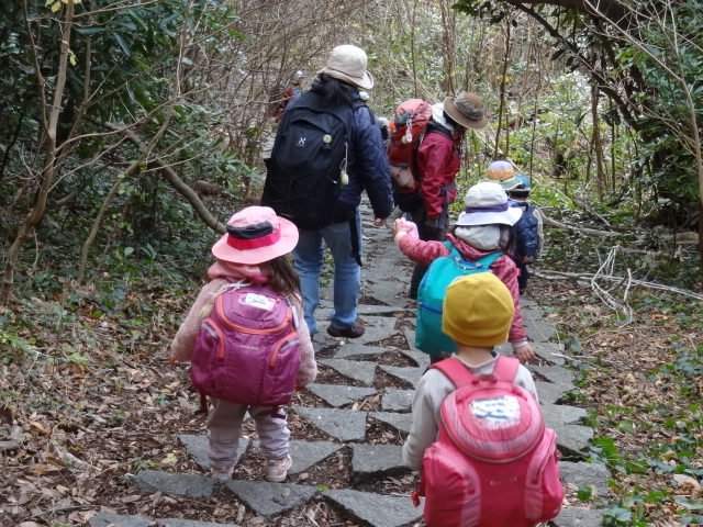 帰りは階段を上って帰ります。「階段、たいへんだよね」「もう疲れた、水休憩!」と疲れが見え始めました。そんな時、エイエイオー!をすると元気が出たね。最後の階段の前にみんなで「エイエイオー!!」よく上りました。