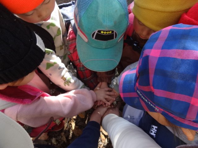 帰りは階段です。「エイエイ、オー!」をすると元気が出たね。7人の手が重ねられるように輪に入れてあげていたね。