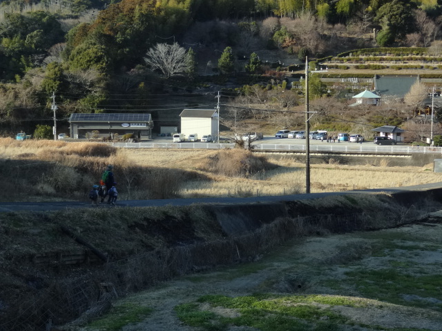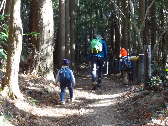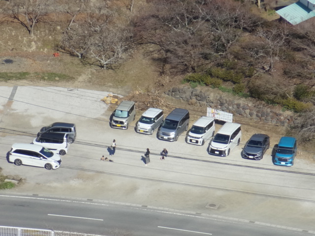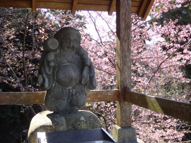 大黒様に着くと河津桜が満開でした。ここで2回目のおやつ休憩です。大黒様からは駐車場が見えます。あれ?お母さんがいるかも?「おーーーーーい!」「おーーーーーい!!」とみんなで呼んでみました。お母さんたちも気が付いてくれたようでした。またまた元気が出ましたね。大黒様に「バイバイ!またねー(また下りでね)」と挨拶しました。