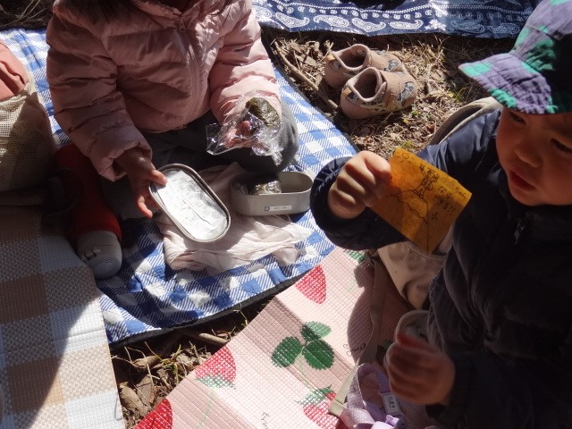 では、おむすびを食べましょう!なんておいしいんでしょう!おうちの人からメッセージがお弁当箱に付いていて嬉しくなったね。ほしぐみさん、がんばれー!って書いてくれてあったね。うん!がんばるぞー!おむすびを食べてからおやつも少し食べました。