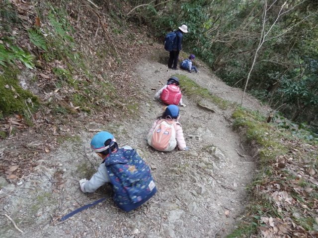 登り始めて30分。最初のおやつ休憩です。子どもたちに笑顔が広がります。おやつに元気をもらってまた登ります。滑りやすい所は手を付きながら登っていきました。