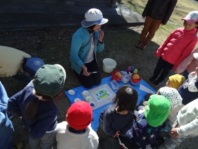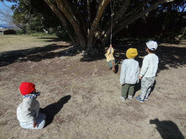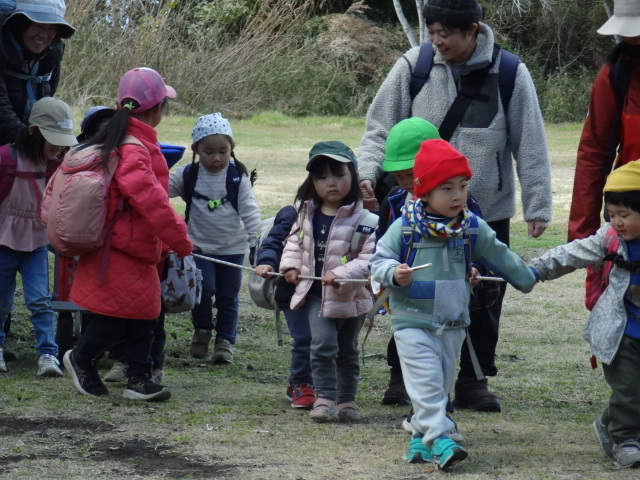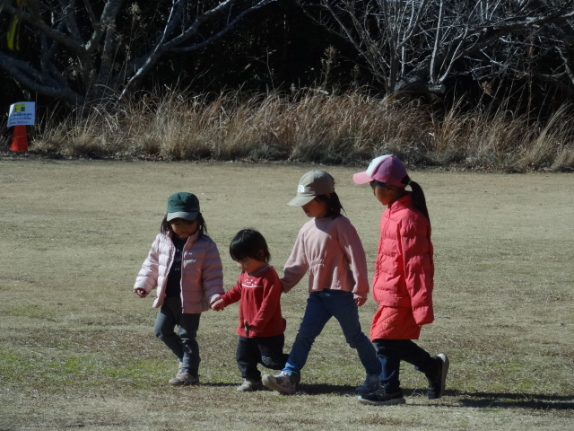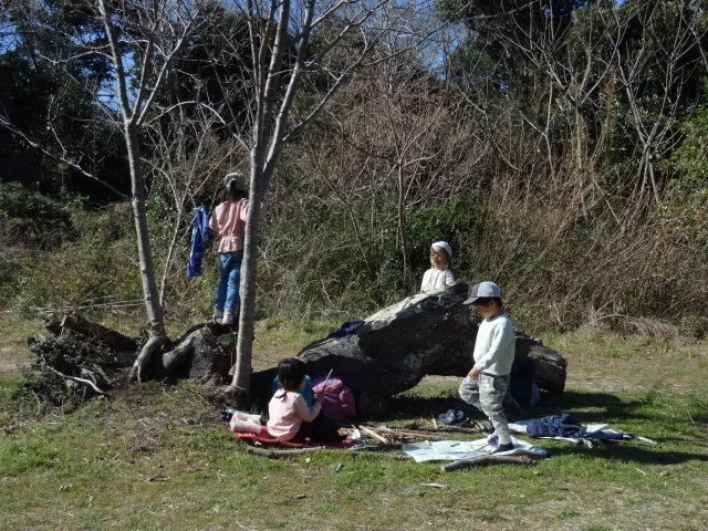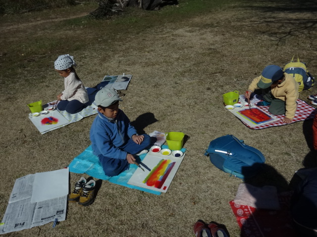 にじみ絵の後は道具を片付けてお昼ご飯にしました。午後は運動園地で暖かな日差しの中遊びました。こちらはおまつりキャンプごっこ。
