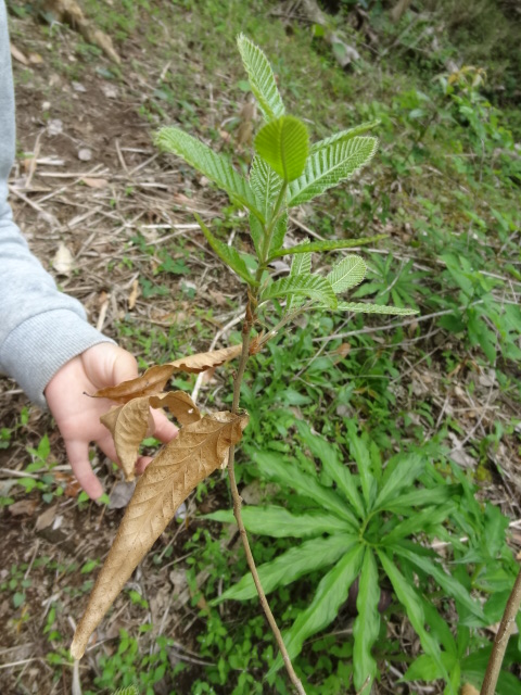 植樹したクヌギには新しい瑞々しい葉っぱが芽吹いています。まだ小さい葉っぱ。赤ちゃん葉っぱだねって。
