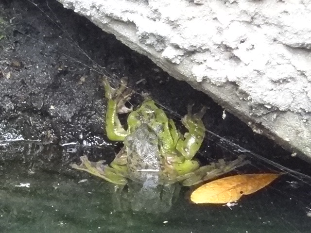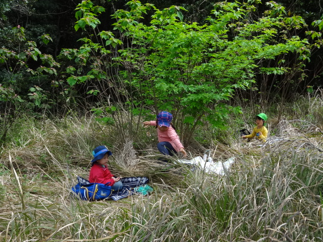 「カエルさーん!」「カエルさーん!」子どもたちの声に反応するかのようにコロロ、コロロと鳴き声が聞こえてきます。そして♪カエルのうたを歌うと、子どもたちの鳴き声がカエルに仲間だと思わせるのか、ますます鳴き声が聞こえ、まさにカエルの合唱でした。