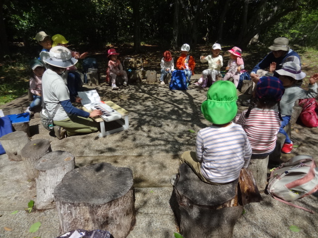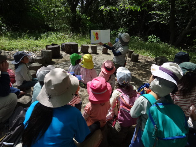 今日は出発の前に絵本「おひさま わらった」を読みました。いつもの私たち、そのもののような絵本でしたね。さあ、花に虫に鳥にたくさんの命とおひさまに会いに行きましょう!