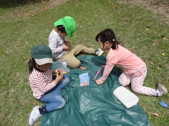 海岸園地では工作を早速始めていました。葉っぱに絵を描いたり、色を塗ったり、穴をあけたり、毛糸を通したり、輪ゴムで止めたり。