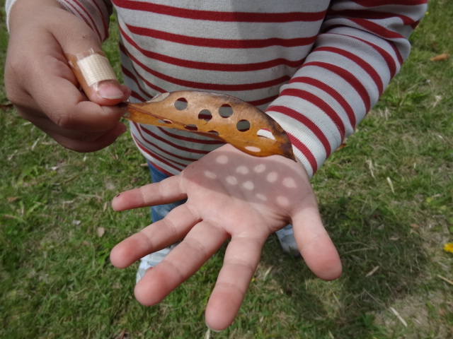 穴をたくさんあけた葉っぱで面白い影ができるのを見つけました。