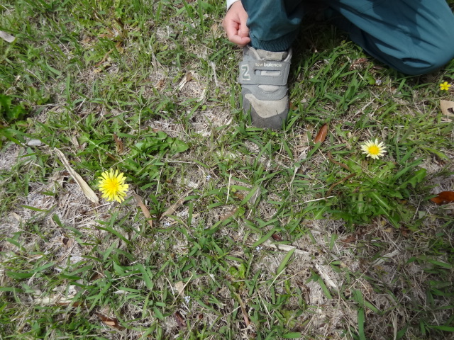 「きてきてー!」と呼ばれて行ってみると、「この白いタンポポの真ん中は黄色いでしょ、だからこのタンポポは真ん中からどんどん黄色くなって、こっちのタンポポみたいになるんじゃない?」なるほどー、このタンポポまた見に来てみよう!