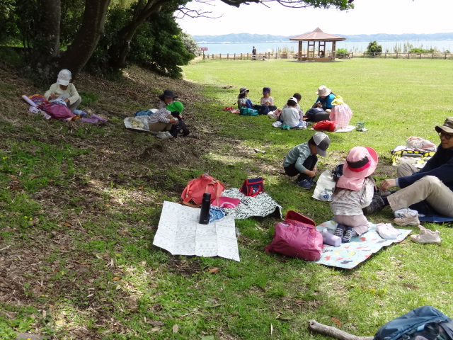おむすびは木の下で食べました。時々トンビが低空飛行をして見回りをしていましたが、無事におむすびを食べ終えました。ここは風が強くて少し寒いくらいでした。食べ終わったら暖かい所へ遊びに行きましょう。
