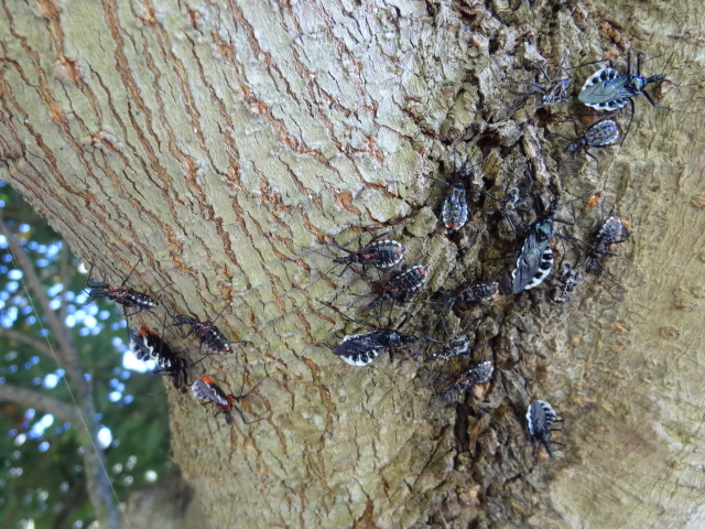 いました!ヨコヅナサシガメ!縁がヒラヒラしており、足の付け根が赤いおしゃれなこの虫は他の昆虫などを刺して体液を吸うのです。はっぴーでは触らないで見るだけの虫です。