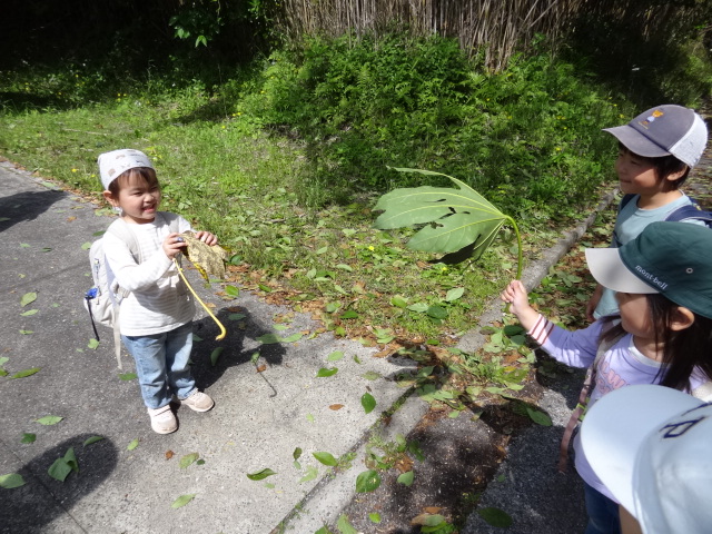 大きいヤツデの葉っぱ。大人の手と比べたけれど葉っぱの方が大きかったね。じゃあ、大きな手で「じゃーん けーん ぽい!」