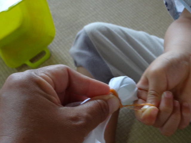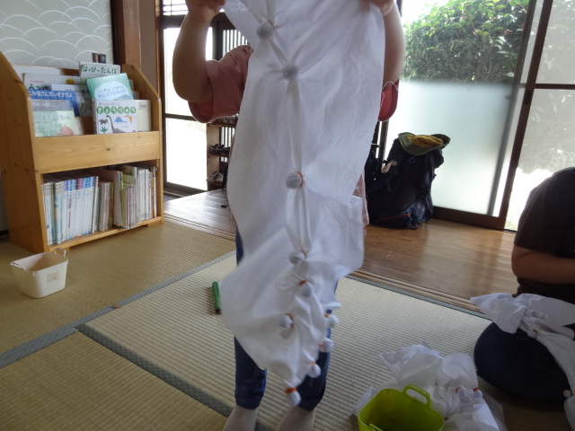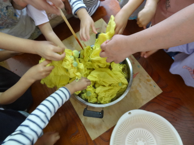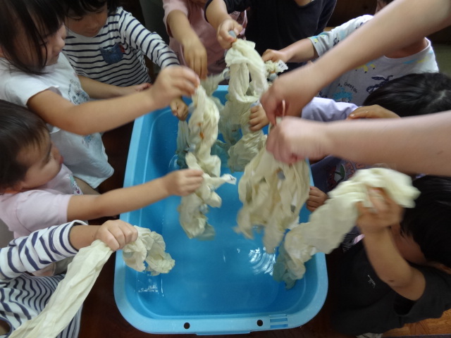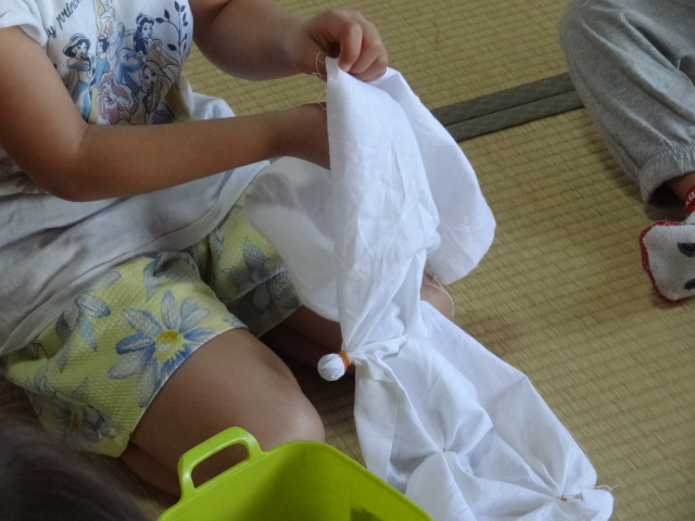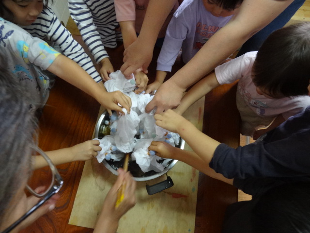 まずは布にビー玉と輪ゴムを使って模様付けをしました。輪ゴムをくるくる括るのが難しかったね。でも大きいビー玉を使ったり、付ける場所を考えるもの楽しかったね。コツを掴んだ子もいて自分でたくさんつけることもできました。