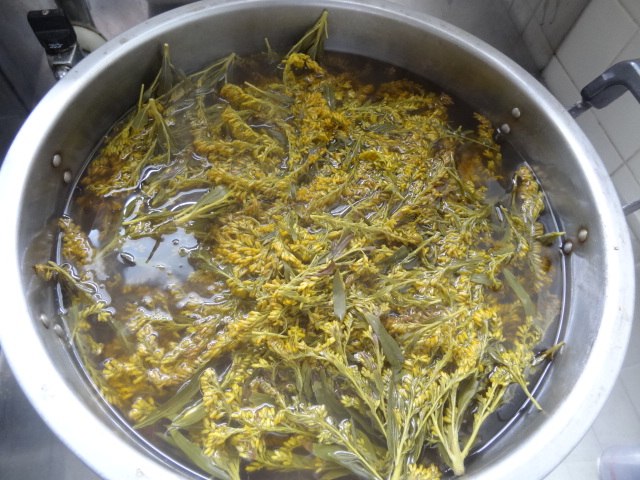 にじもくの今日ですが、ひかりぐみ、ほしぐみもはっぴーはうすを半分使わせてもらい、草木染めをしました。今年はセイタカアワダチソウを使って染めます。