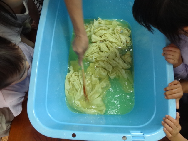 セイタカアワダチソウをグツグツにて煮出した染液は茶色でした。黄色いお花なのにね、いいにおい!と話す子どもたち。それでは染液にみんな同時に浸けます。「せーの!」染液は熱いのでそーっと入れました。染液のお風呂ではムラにならないように混ぜます。すると染液が透き通ってきました。その分、布に色が付いているということになります。