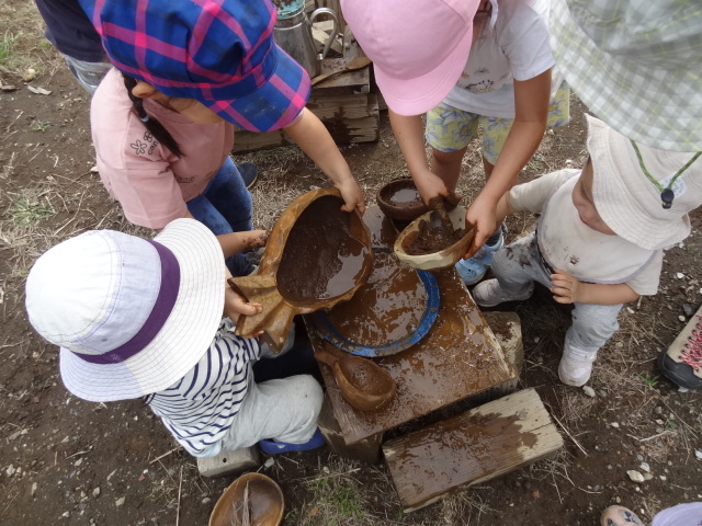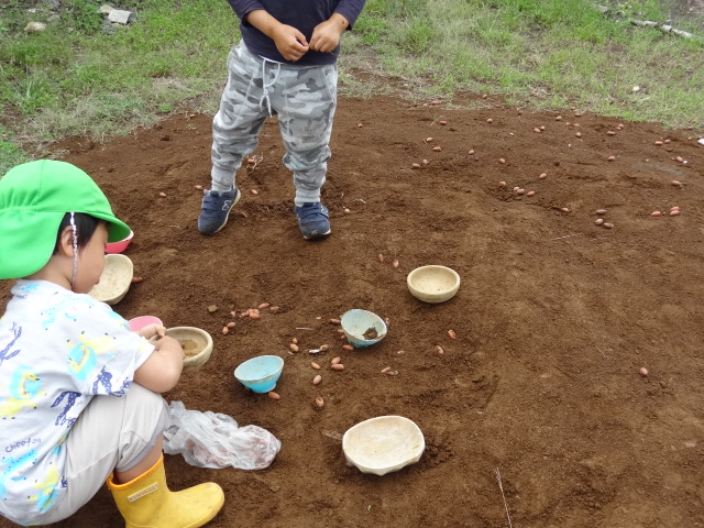 午後からは外で遊ぶ子が多かったです。今日は水たまりができていました。水があると泥んこ遊びができますね。
