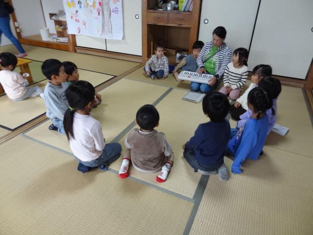 では、なおぴーとわらべうたで遊びましょう。最初は♪ぶーぶーぶーたしかにきこえる ぶたのこえー♪にじぐみさんが輪の中に入って向かい合ってやりました。一人ずつ移動していくので自分の前に来るのが楽しみなひかりぐみさん、ほしぐみさん。一緒にやるともっと楽しいね。