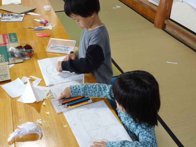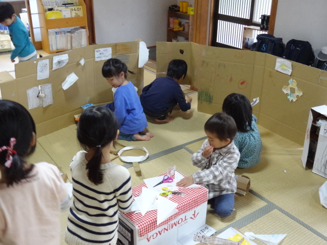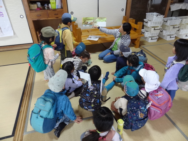 おむすびを食べ終わってから「外で遊びたーい」との声もありましたが、雨はしとしと降り続いておりとても寒いので室内で遊ぶことにしました。