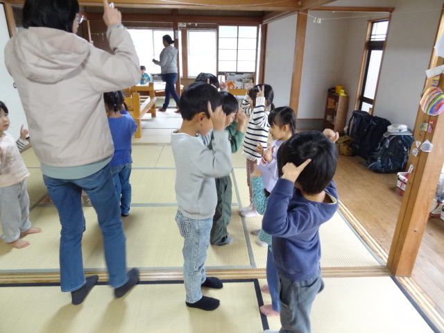 今日はもっちこではなくて♪かれっこ やいて♪こどもたちも焼きたいものを言いました。サンマ、マンボウ、もち、ぎょうざ、ポテトなどどれもおいしそうで、歌っているとどんどんお腹が空いてきましたね。