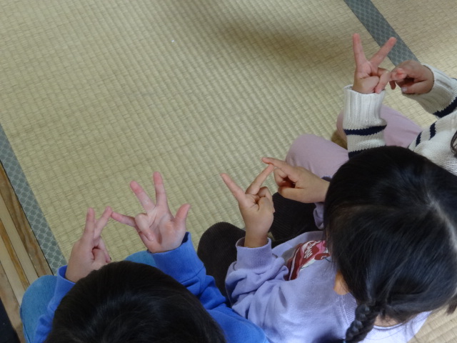 次はみんなもよくやる♪こどもとこどもが けんかして♪ それから♪ふくすけさーん えんどうまーめが こーげるぞー♪歌の最後で指を折っていきます。最後に残るのは何指?