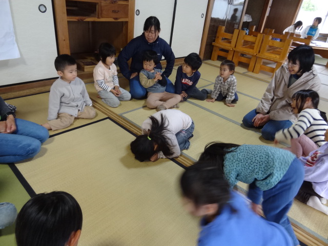 今度は鈴を使ったわらべうた遊び♪ちんちろりん♪鈴が鳴らないようにそーっとお隣さんに手渡したり、歌の最後の人は鈴を鳴らして真ん中にいるオニ役の子がどこから鈴が鳴っているか当てました。