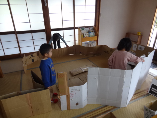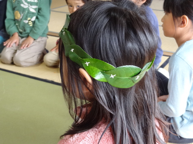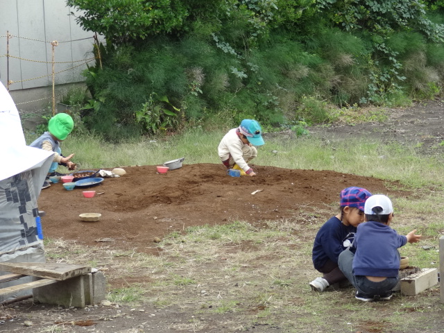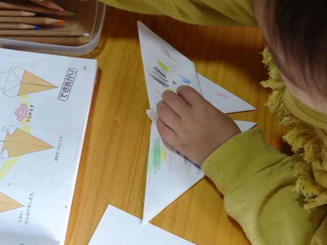 午後からは雨が少し降ってきましたが、カッパを着て外遊びに出ていきました。室内ではおうちごっこや折り紙やその折ったものに色を塗ったりしました。