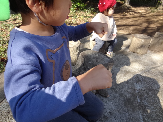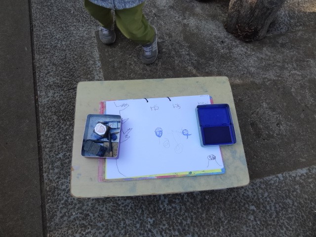 ほしぐみ、ひかりぐみは大房に集合です。お日さまが出て気持ちのいい朝でしたが風がありました。朝のスタンプの紙が風でめくれてしまうのを「こうすればいいんじゃない?」スタンプが入っている箱とフタを両端においてくれた、ほしぐみさん。ほんとうだね。これで大丈夫だね!