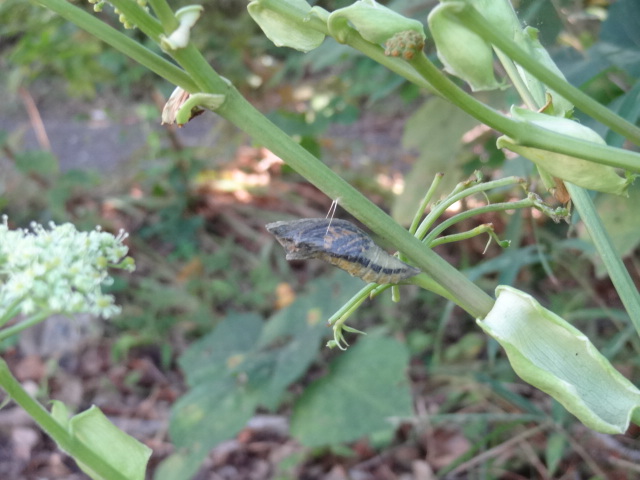 一番最初に見つけた蛹(10月7日に幼虫がじっとしているところを発見)は模様が透けて見えるようになっていました。蝶になって飛び立つ日が近そうです。