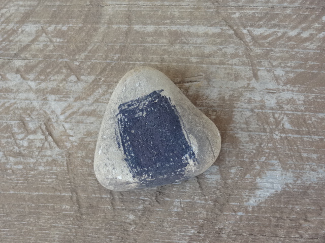 「おにぎり食べる?」の声に振り向くと、石のおにぎりが!こんなきれいなおにぎり型の石、なかなかないですね。マジックで海苔を描いたようです。