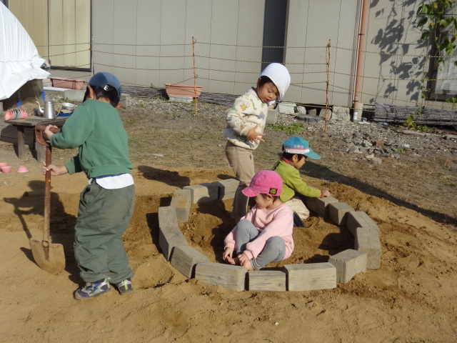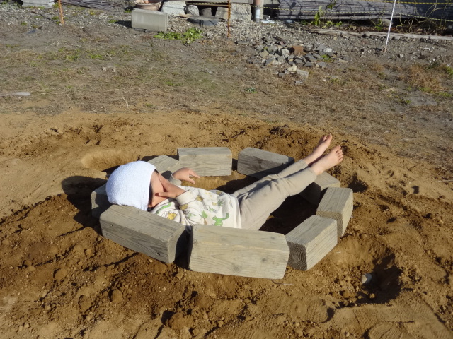 予報通り強くなった風にも負けず、土埃にも負けず再び外で遊びました。こちらはお風呂。
