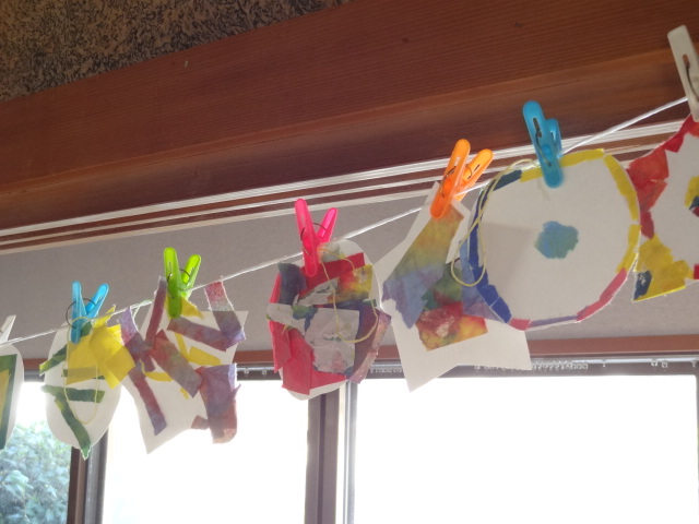 今日は午後から風が強く吹く予報でしたのではっぴーはうすで過ごすことになりました。先日にじみ絵をした紙にオリーブオイルを塗って、キャンドルホルダー作成の準備をしましょう。