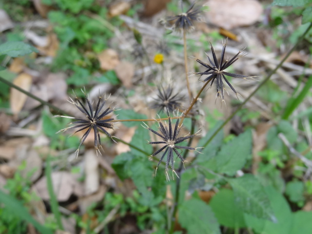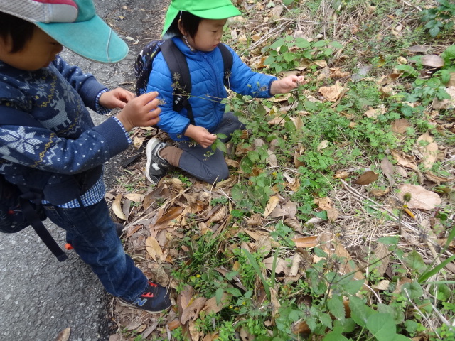 見つけたのは”ひっつきむし”と呼んでいる草の種。これがよくくっつくんですよね。わーくっついてるー!って言いながら服から取ってパラパラと地面に落とします。こうやってこの草はあちこちで芽を出すのでしょうね。