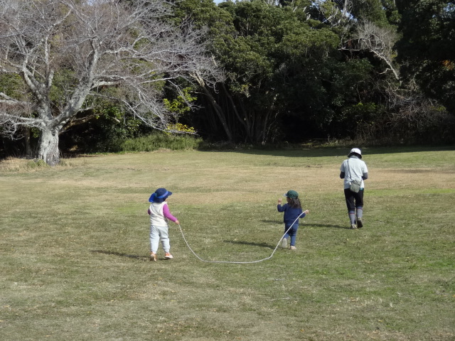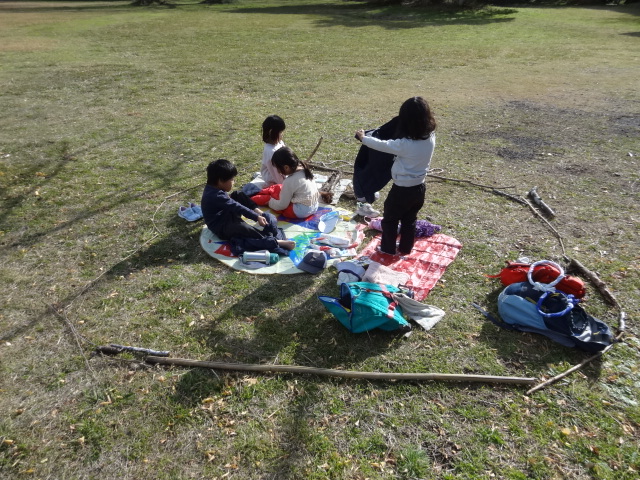 運動園地に到着です。日なたで食べるとぽかぽかと暖かくのんびりした気分になりますね。午後からは鬼ごっこや、海賊ごっこ、お祭りごっこ、縄跳びなどをして遊びました。