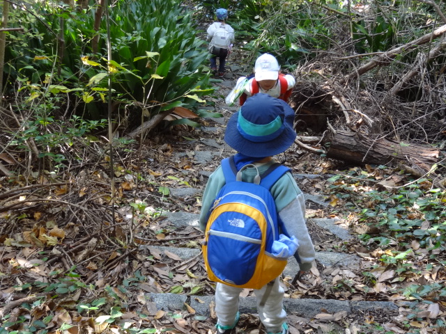 午後からは海賊ごっこや滝の所に行って池で魚釣りや岩登りなどをして遊びました。南芝生園地の坂道を何往復してもへっちゃらな子どもたち。帰りもようやく上がってきた子もまた下に誰かが残っていると、「帰るよー」って言ってくる!と再び下へお迎えに行っていました。迎えに来てくれると嬉しいよね。じゃー帰ろうかなって気分になるよね。