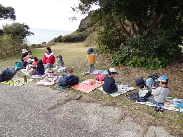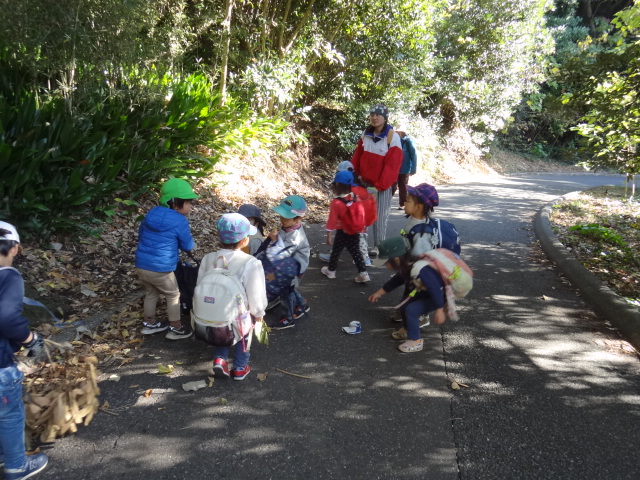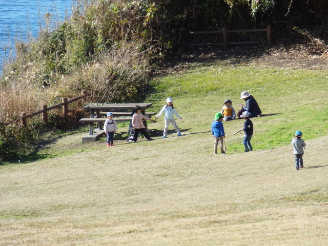 ほしぐみ、ひかりぐみは今日も大房で遊びました。今年最後の大房なので今日もたくさん遊びましょう!北風が冷たい朝でした。ぐるりとお散歩をして南芝生園地か海岸園地で遊びましょう、ということで出発です。